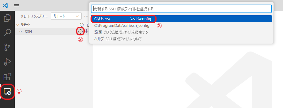 - プライマリサイドバーより「リモート」>「SSH」の右側にある「⚙」マークをクリック