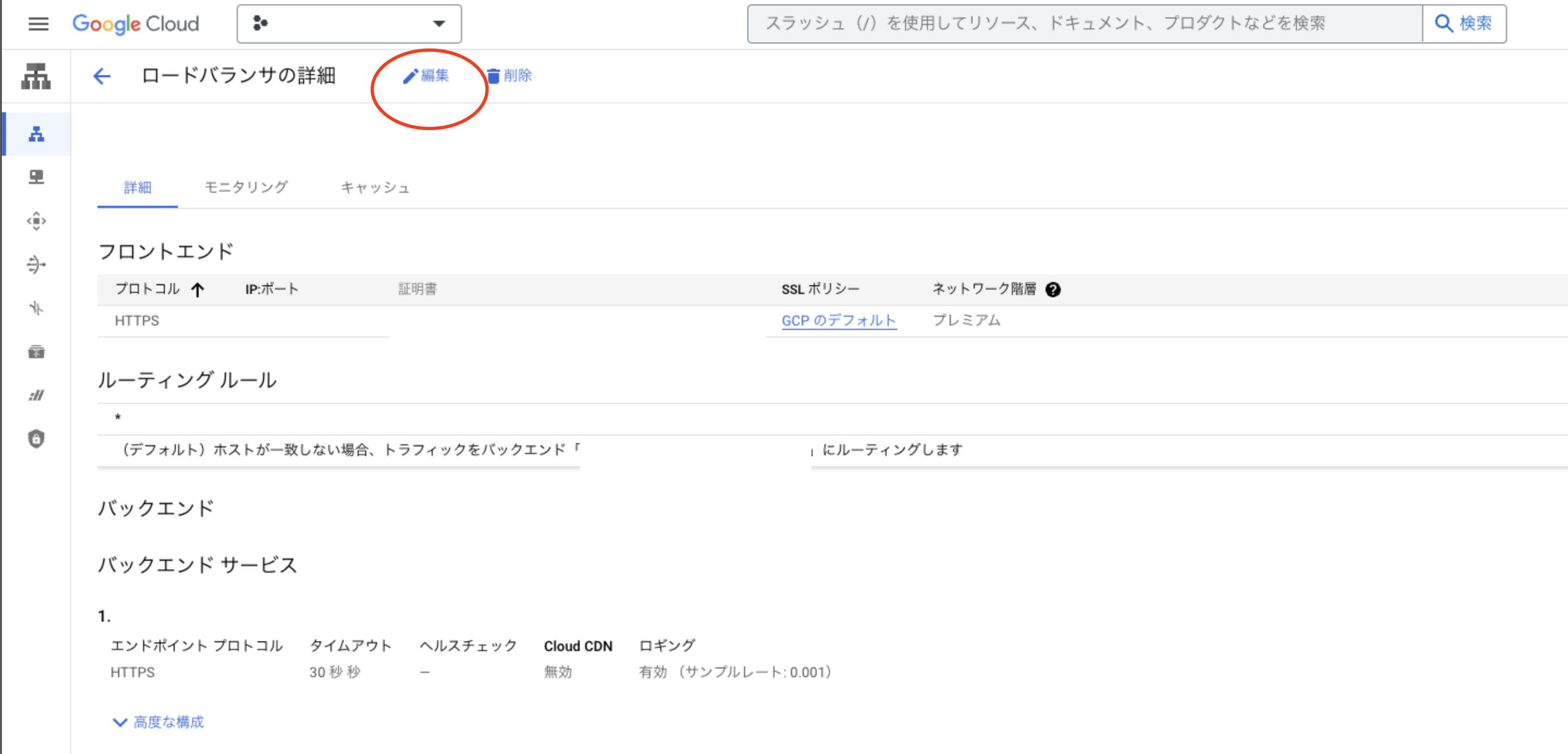 2. 「ロードバランサの詳細」画面から「編集」を開く。