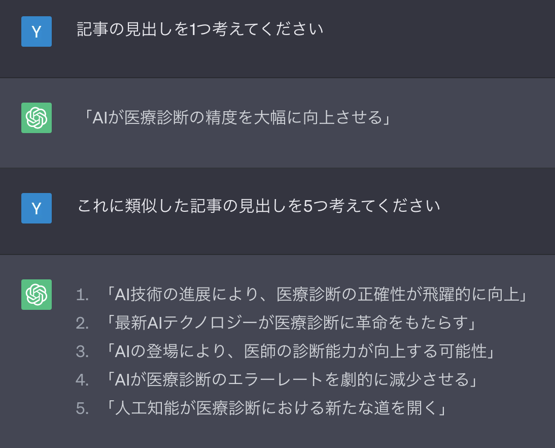 前回は文の類似度を計算して終わりましたが、今回は応用として記事のタイトルの類似度を算出していきたいと思います。まずは、使用するデータをChatGPTに生成してもらいます。