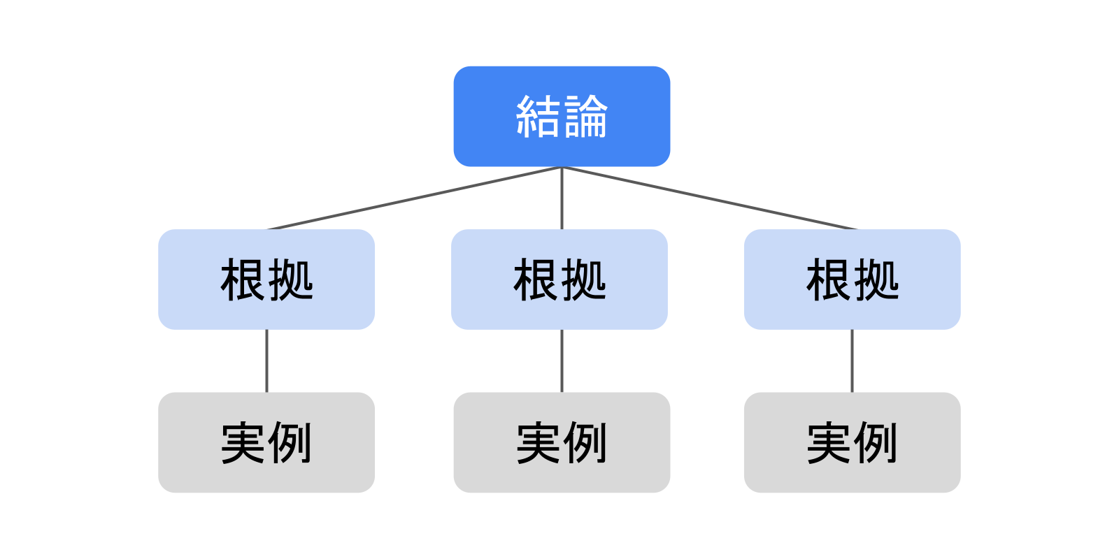 になり、これが結論になります。具体例や事実は根拠の裏付けです。具体例を聞き手に話して内容をイメージしてもらうことで、共感や理解に繋げます。