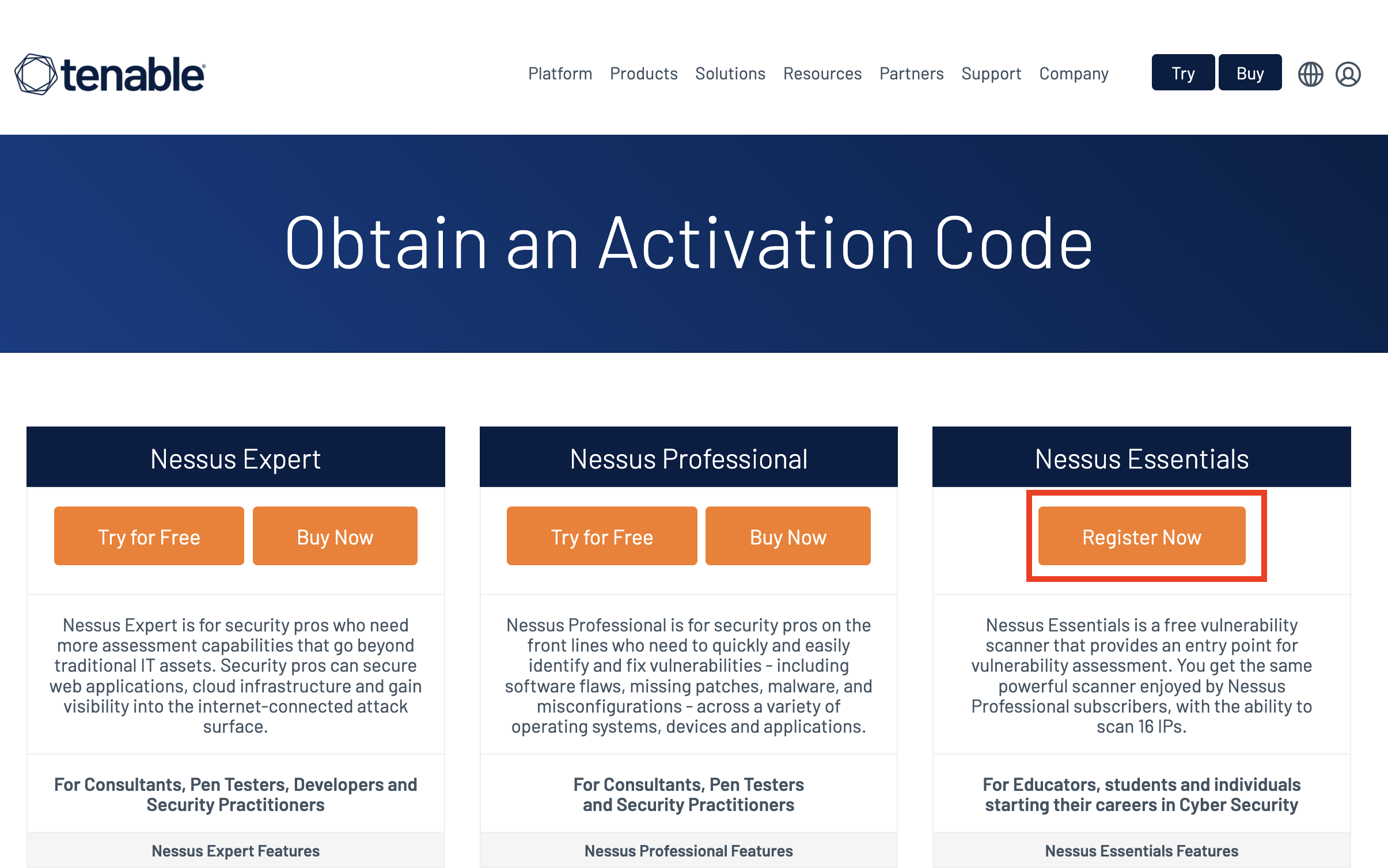 今回は無料版を使用するので「Nessus Essentials」の「Register Now」をクリック。