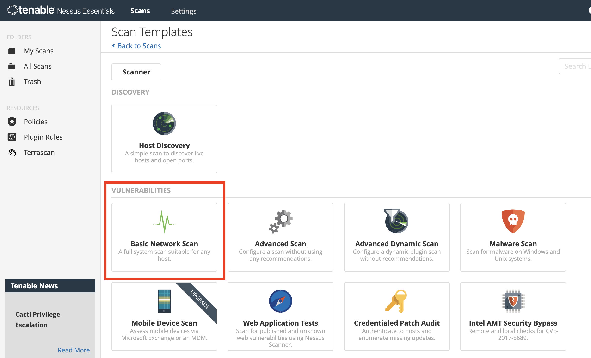 この画面ではスキャナーという診断に使用するツールを選ぶことができます。デフォルトでいくつかのスキャナーが用意されていますが、今回は「Basic Network Scan」を選択します。