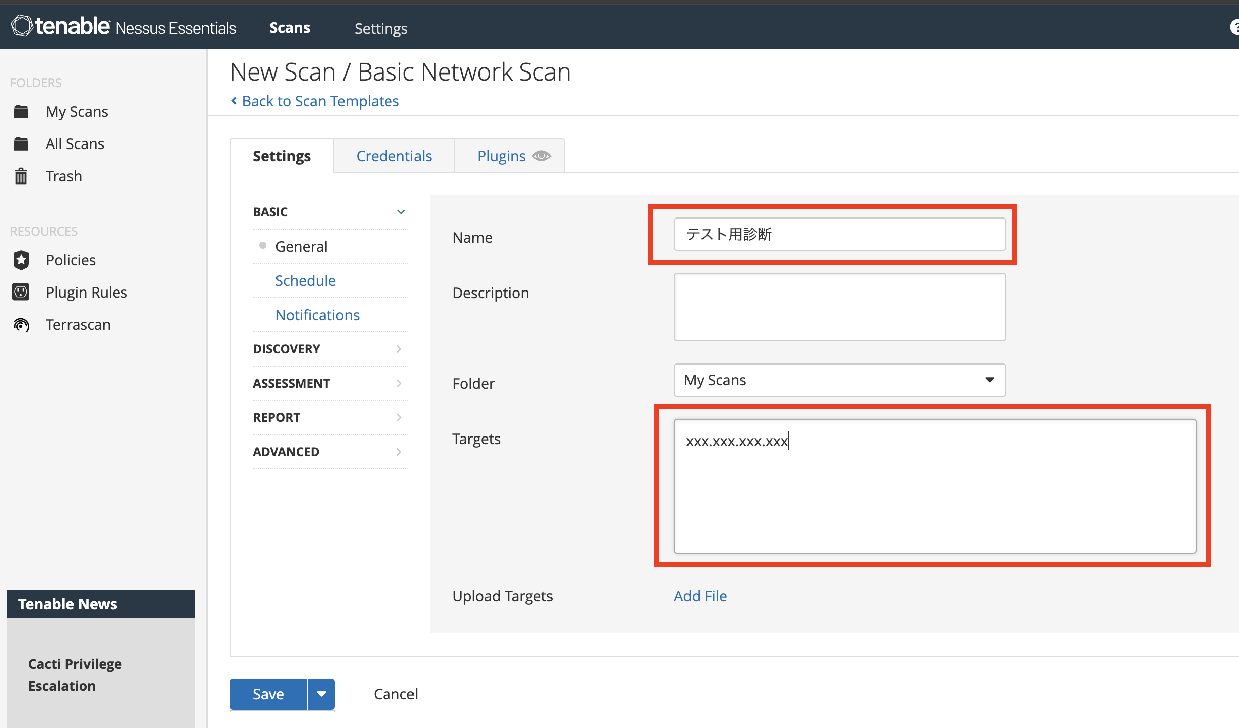 スキャンの設定では「Name」と「Targets」を入力して「Save」します。Targetsには診断を行いたいIPアドレスを入力してください!(無料版では16個まで指定可能です)