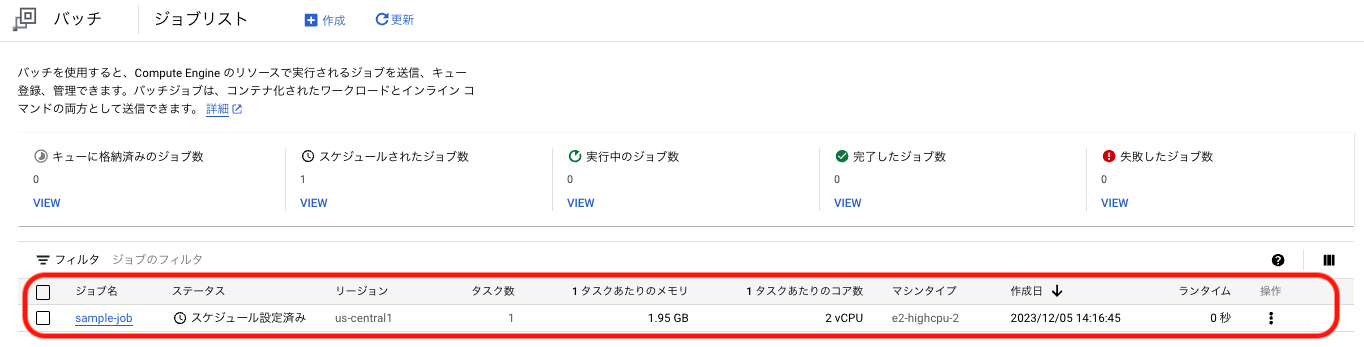 $ gcloud batch jobs submit sample-job --config=[定義ファイル] --location=us-central1