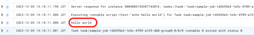 { "taskGroups": [ { "taskSpec": { "runnables": [ { "script": { "text": "echo hello world" } } ] }, "schedulingPolicy": "IN_ORDER" } ], "logsPolicy": { "destination": "CLOUD_LOGGING" } } |