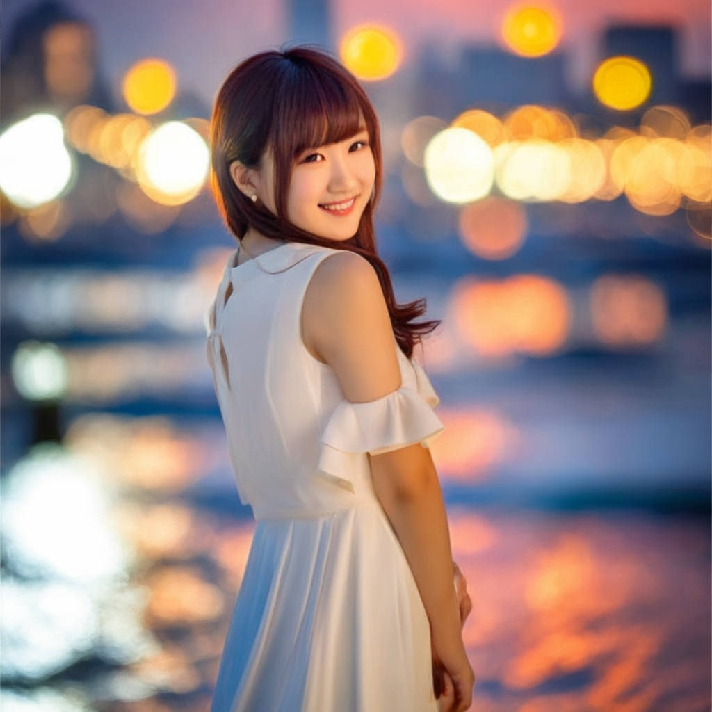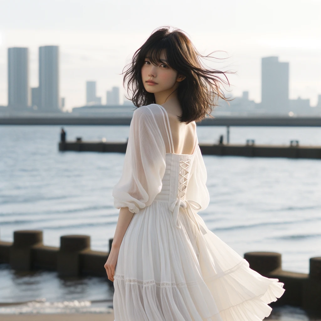 - 元画像の女性について、都会の海で風に吹かれているような画像に直す