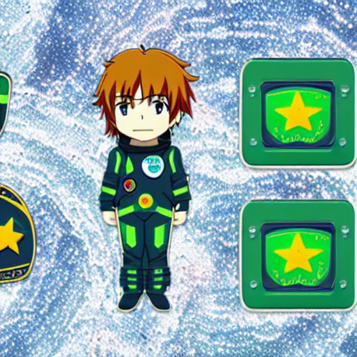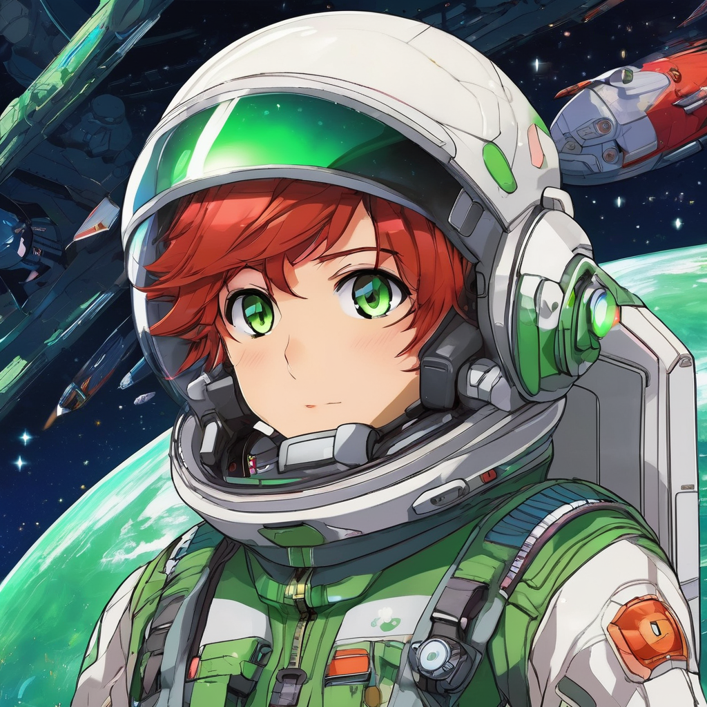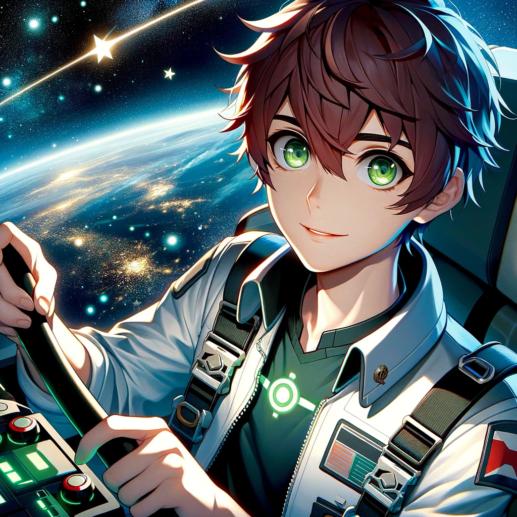 - 宇宙の冒険者:遠い宇宙の星々を背景した、宇宙飛行士のスーツのような装備を身につけた緑色の瞳を持つ日本のアニメキャラクター調の男の子