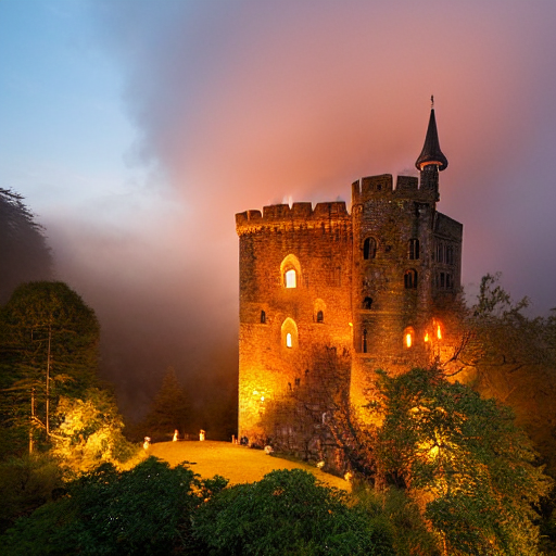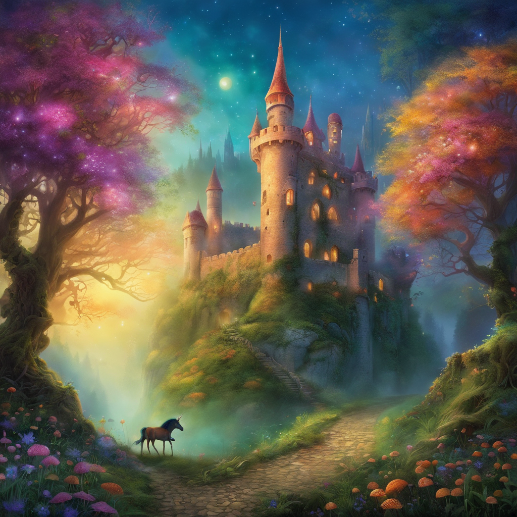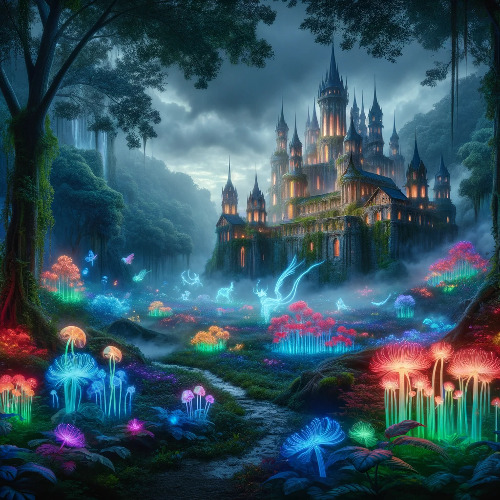 - 魔法の森の中にある古い城:古代の城が霧に包まれた魔法の森の中にあり、周囲は色とりどりの光る花や神秘的な生き物で溢れている
