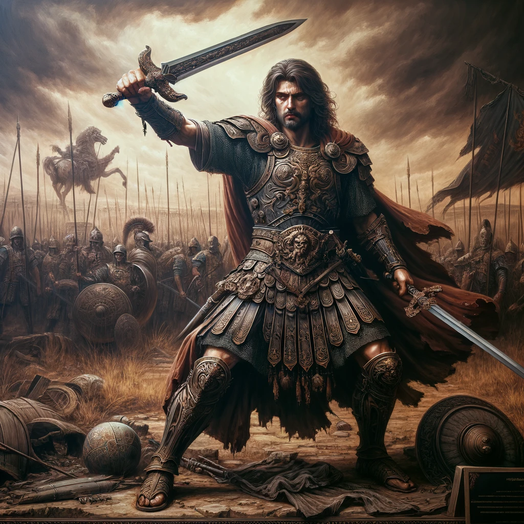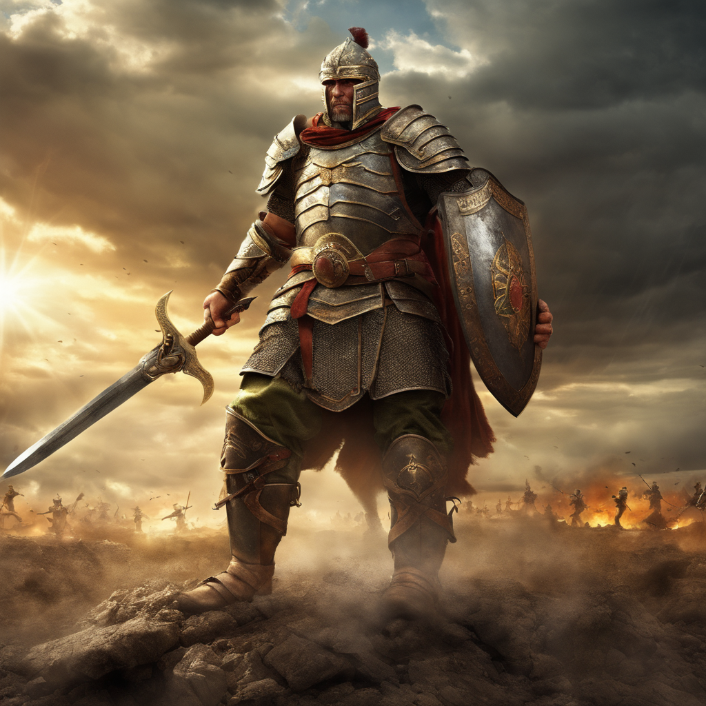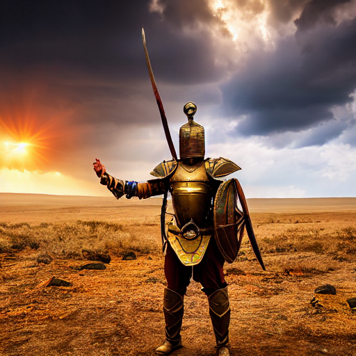 - 古代の戦士:古代の甲冑を身に着けた勇敢な戦士が、手にした剣を高く掲げている。背景は荒涼とした戦場