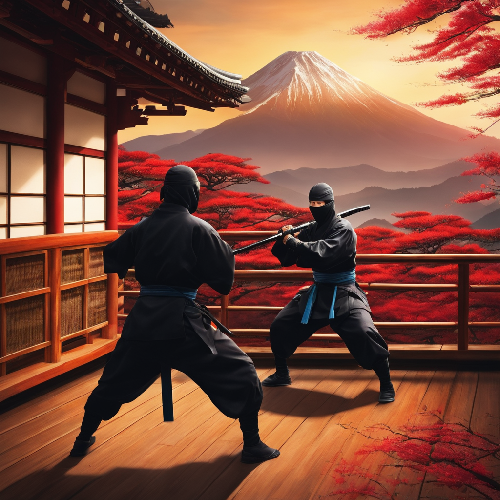 - 忍者の訓練:秘密の忍者の訓練場で、忍者が武器や身体能力を鍛えている様子。背景には日本の山々が見える