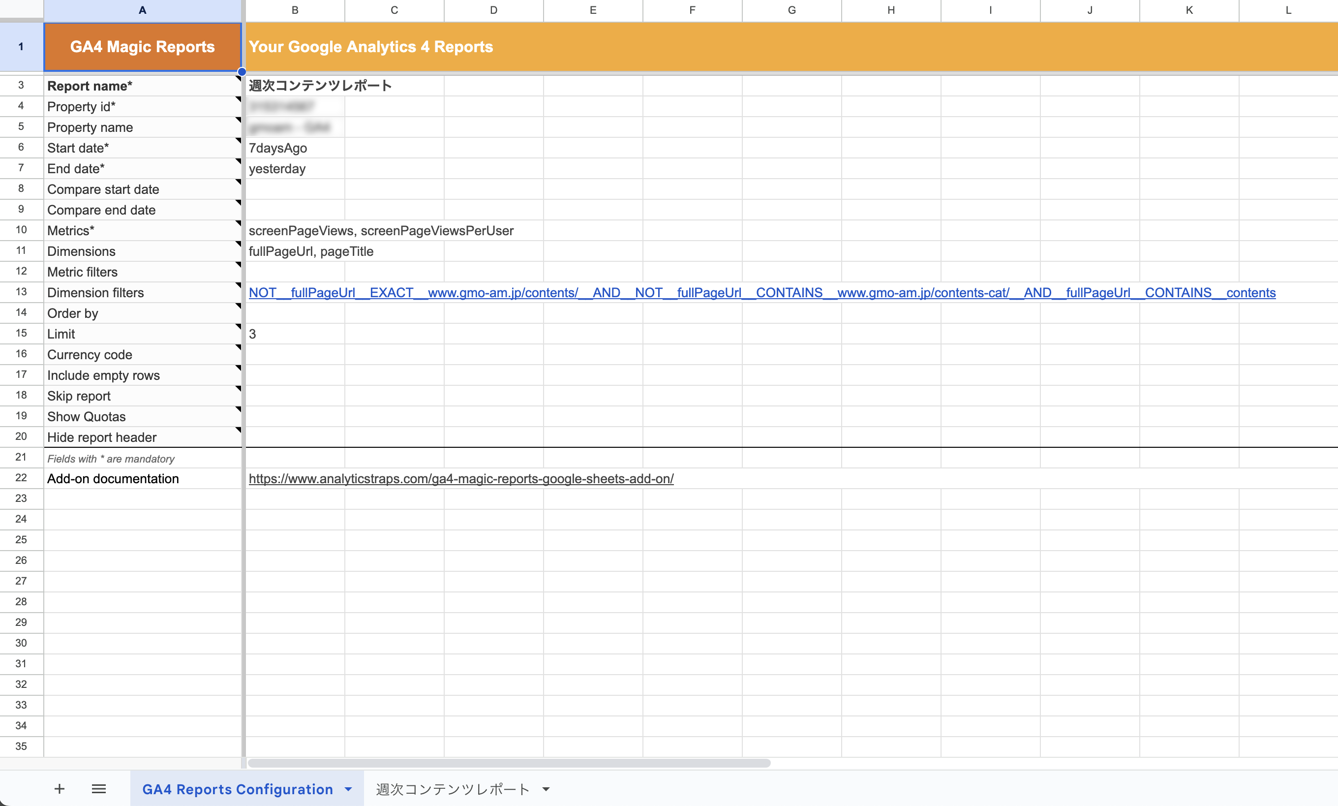 - Google スプレッドシート のアドオン「GA4 Magic Reports」を使って、取得したい情報をリスト化