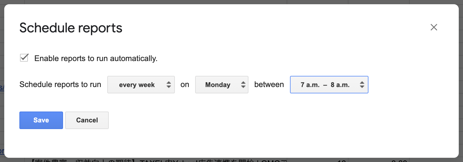 最後に、「拡張機能>GA4 Magic Reports>Schedule Reports」で自動更新の設定をします。