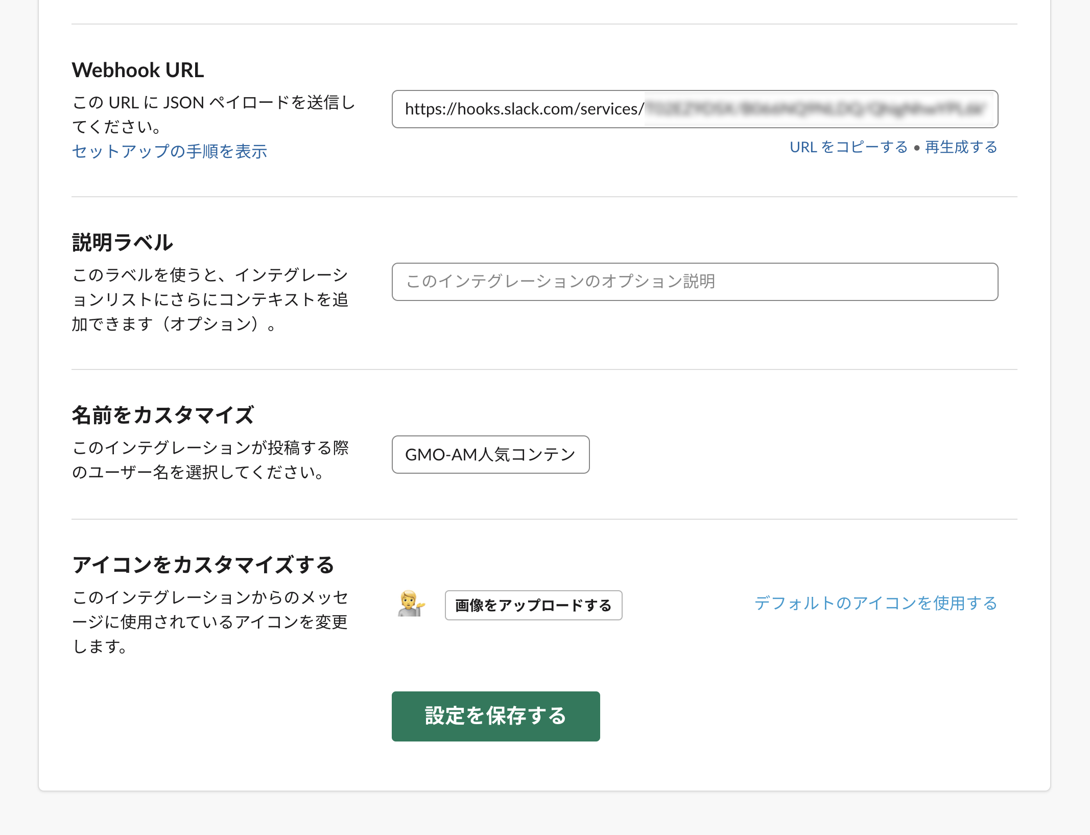 Incoming Webhookの設定画面から、取得したURLをコピーしてきて設定します。
