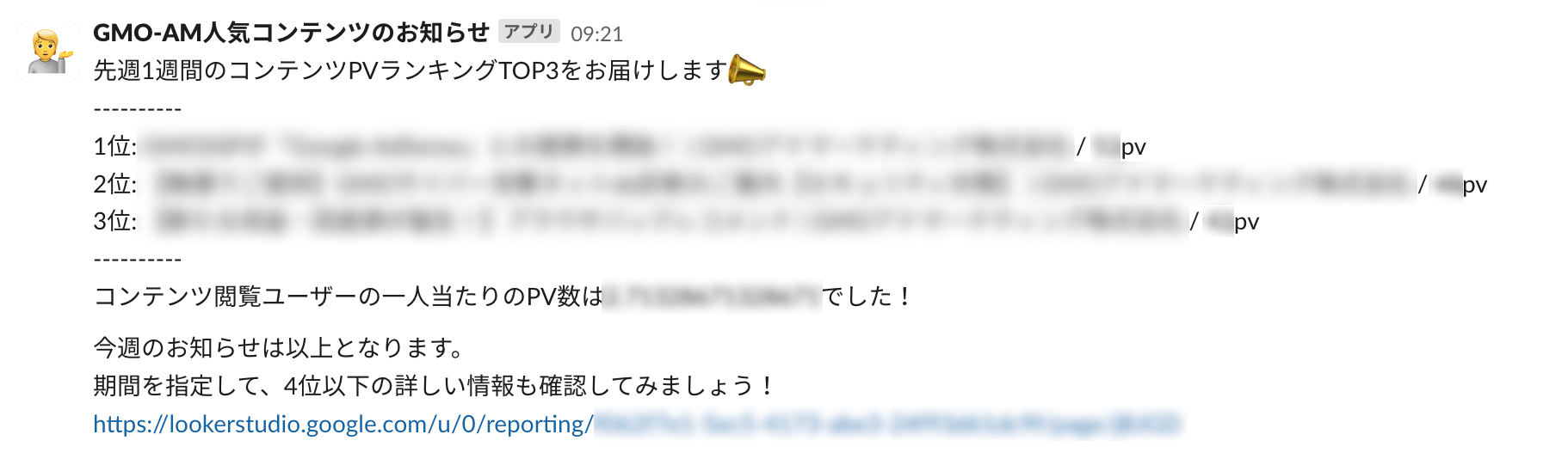 var slackText = "先週1週間のコンテンツPVランキングTOP3をお届けします📣\n" + "----------\n" + "1位: " + List1st + " / " + List1stpv + "pv" + "\n" + "2位: " + List2nd + " / " + List2ndpv + "pv" + "\n" + "3位: " + List3rd + " / " + List3rdpv + "pv" + "\n" + "----------\n" + "コンテンツ閲覧ユーザーの一人当たりのPV数は" + ListPageViewsPerUser + "でした!" + "\n" + "\n" + "今週のお知らせは以上となります。\n" + "期間を指定して、4位以下の詳しい情報も確認してみましょう!\n" + "https://lookerstudio.google.com/u/0/reporting/xxxxxxxx"; //既存のLooker Studio レポートURLを記載 sendSlack(slackText); |