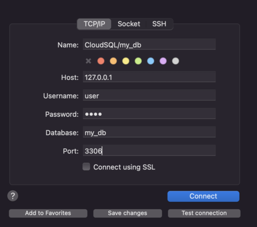 - Port: cloud-sql-proxyコンテナの外部port番号(起動時に指定したもの)