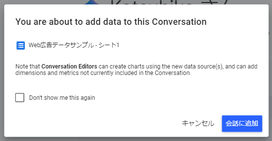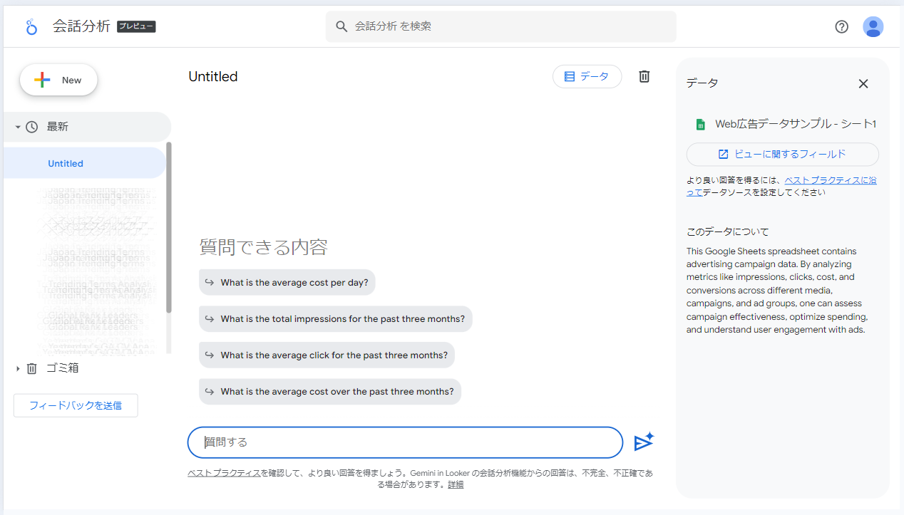データに接続された状態で、「会話分析」のチャット入力画面が開きます