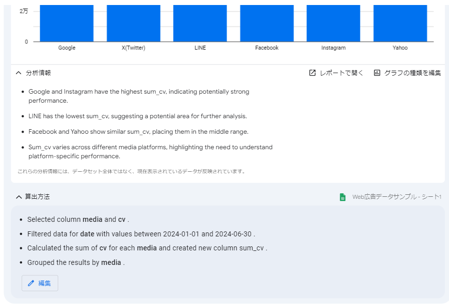 「算出方法」では、集計条件の内容を確認できます。もし、集計する対象のカラムが間違っていた場合などは「編集」ボタンをクリックして変更することも可能です。