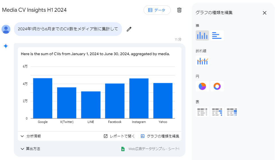 また「グラフの種類を編集」をクリックすると、右側にウィンドウが開き、変更したいグラフの種類が選択できます。