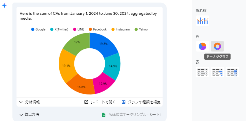 ドーナツグラフを選択すると、瞬時に切り替わります。