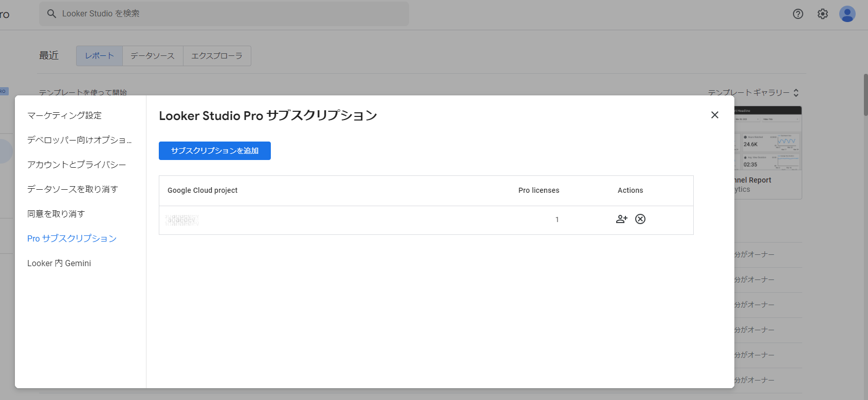 左側のナビゲーションで [Pro サブスクリプション] を開き、[サブスクリプションを追加] をクリックすると、Google Cloudのプロジェクトを選択して、任意のユーザーに付与することができるようになります。