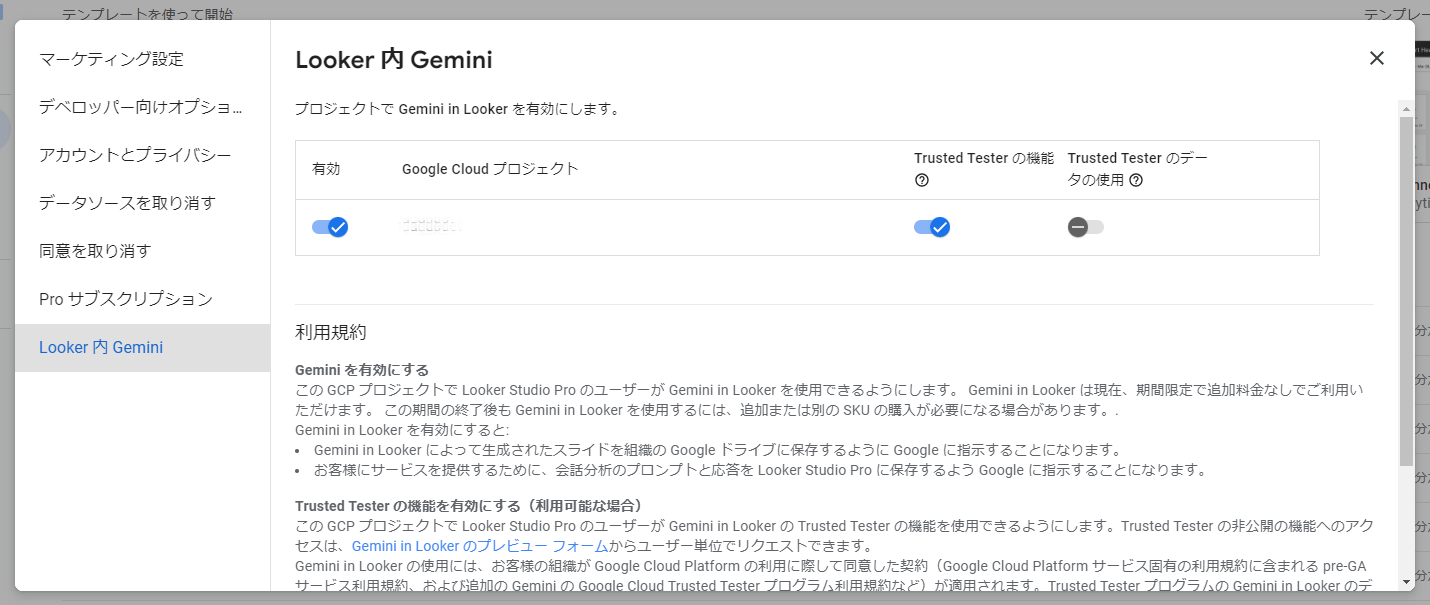 また、同じ画面で「Looker 内 Gemini」を開いて、 「Gemini in Looker」 を有効にしてください。