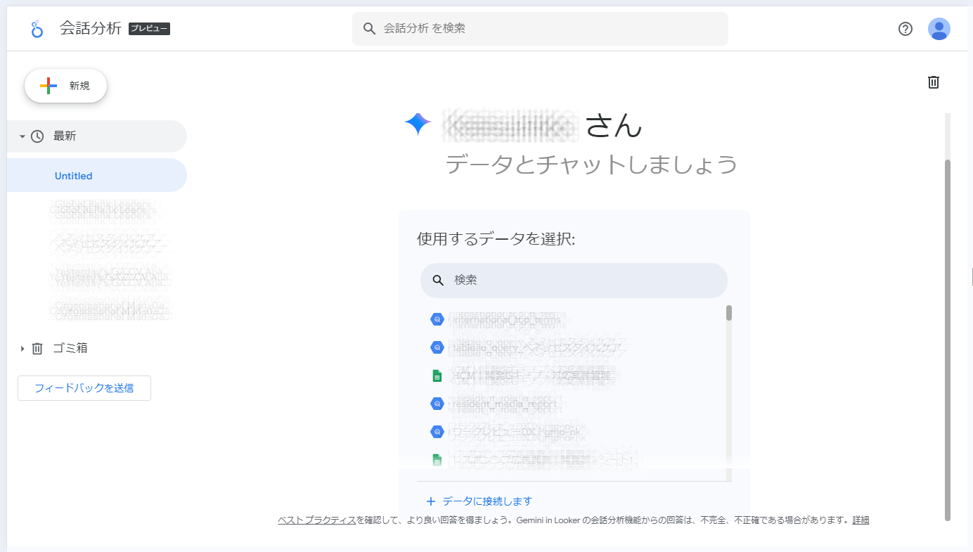 Gemini in Looker の主な機能として、「計算フィールドの作成」や「スライドの自動作成」といった機能もありますが、今回は、新しく利用できるようになった「会話分析(Conversational Analytics)」だけ試してみます。