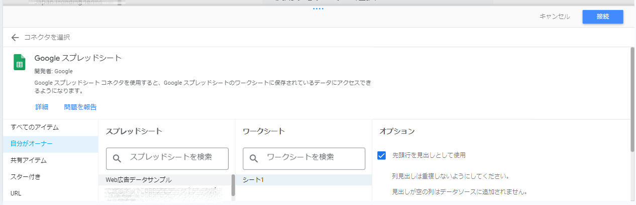 BiqQueryやLookerにも簡単に接続が可能になっていますが、今回は事前に用意したスプレッドシートのサンプルデータに接続してみます。