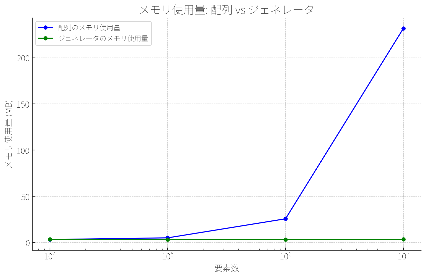 ジェネレータは必要になったタイミングでのみメモリ確保するため、メモリ使用量はほぼ一定です。要素が多くなるほど配列とのメモリ使用量の差が顕著に現れます。上記グラフで言うと、100,000個以上からその差が如実に現れ始めますね。