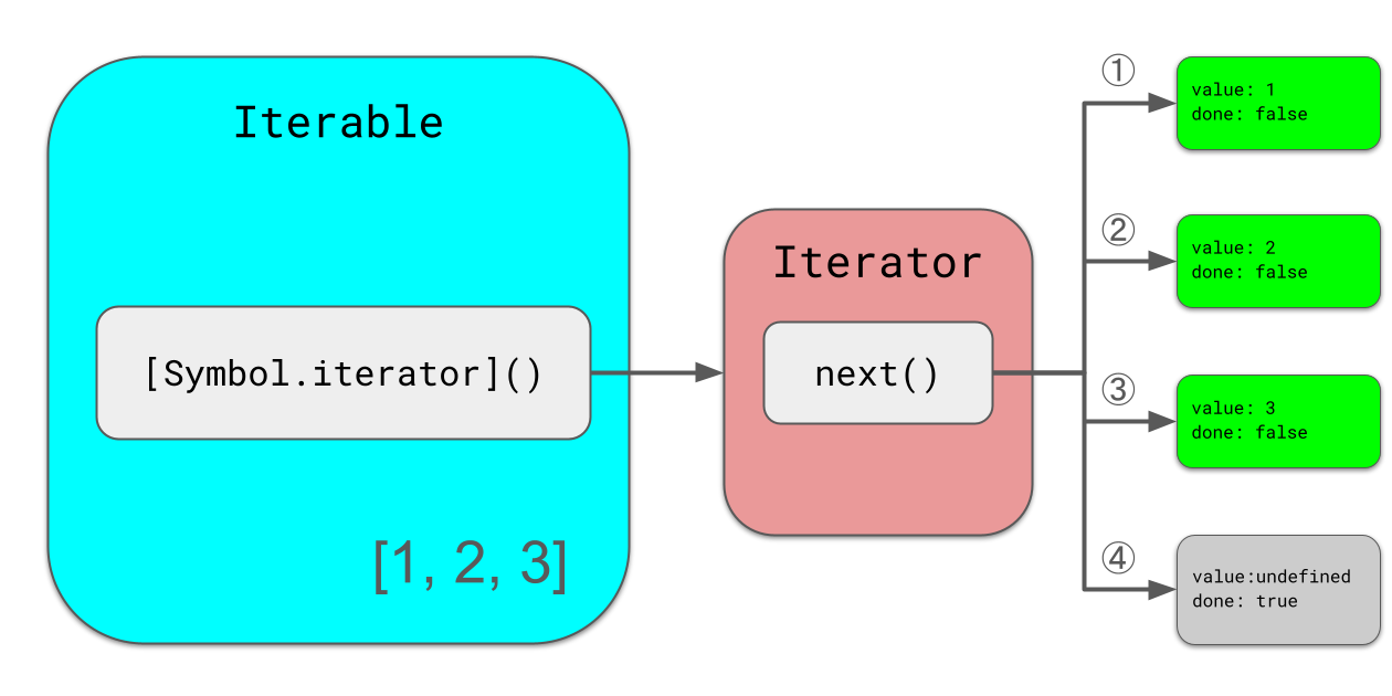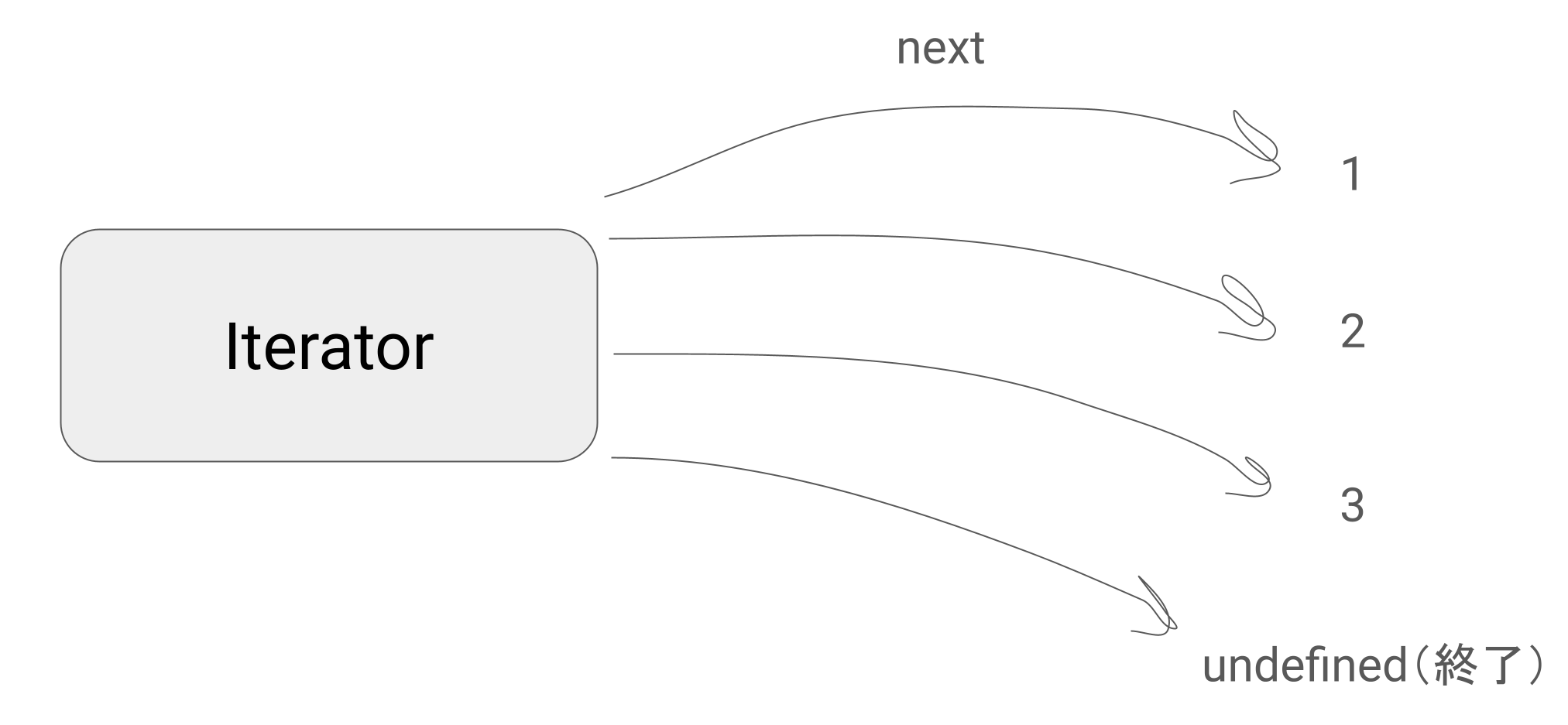 const array = [1,2,3]; const fetchSample = array[Symbol.iterator](); // イテレータを返す関数の呼び出し fetchSample.next(); // { "value": 1, "done": false } fetchSample.next(); // { "value": 2, "done": false } fetchSample.next(); // { "value": 3, "done": false } fetchSample.next(); // { "value": undefined, "done": true } |