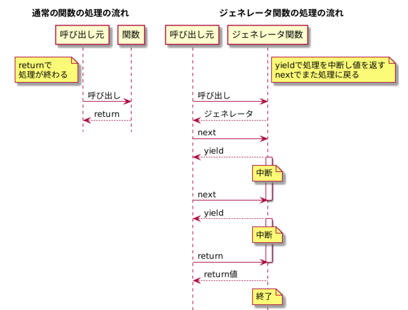 yieldによってジェネレータ関数の処理の中断と再開が可能